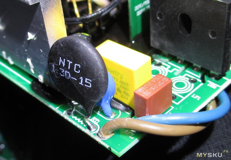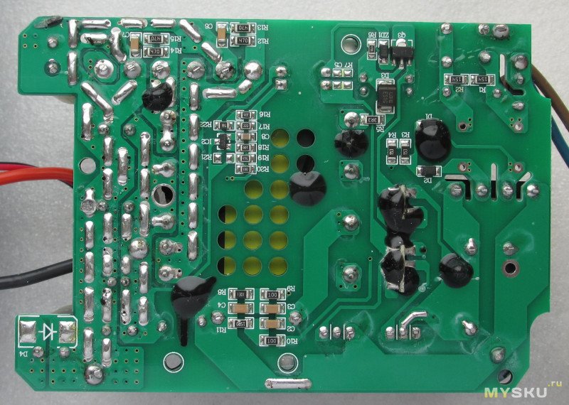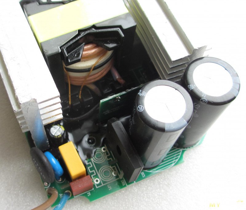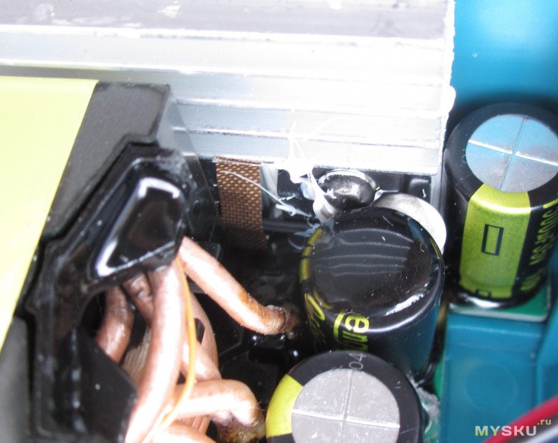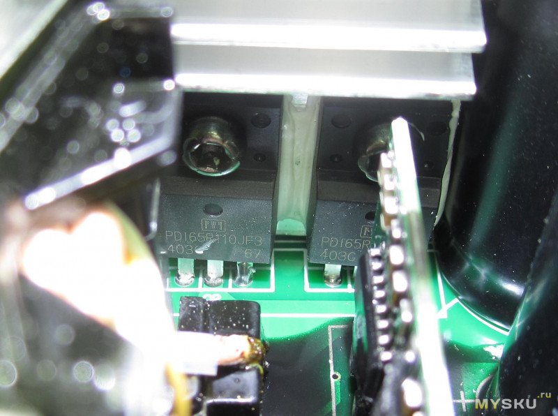 Шим-контроллер залит лаком и маркировку разобрать не получилось. Транзисторы — пара PDI65R110JF3. К диодным сборкам прикреплен термодатчик, так что подобраться к ним без демонтажа тоже не получилось.