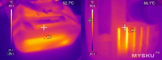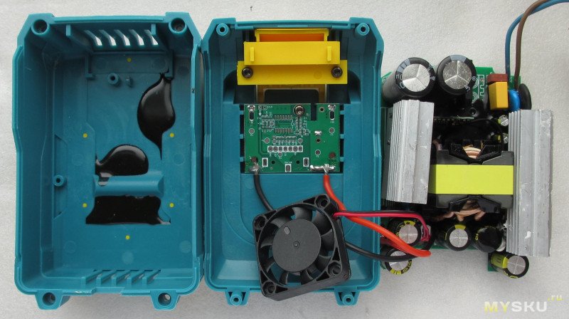 Стоит отметить нелогичность с организацией активного охлаждения — поскольку вентилятор питается от общего (и единственного) выхода, то при отключении он останавливается и охлаждать перегретый инструмент перестает, а было бы неплохо. Потоки воздуха от него идут «как получится». Эффективность охлаждения недостаточна для долговременной работы с заявленным максимальным током (попытка сдуть полторы сотни ватт тепла 40мм вентилятором с умеренными оборотами выглядит утопично).