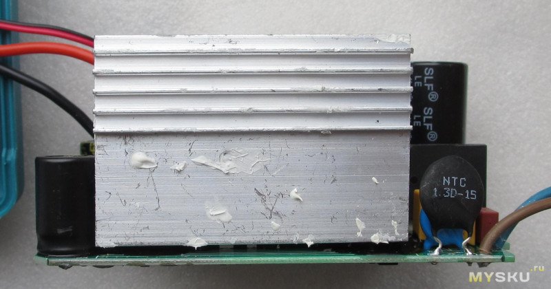Радиаторы не имеют своего крепления к плате, держатся они на выводах деталей, и если большой на двух диодных сборках в то247 достаточно жестко, то мелкий на паре транзисторов в то220 болтается. К диодным сборкам закреплен термодатчик, который отключает бп при перегреве.