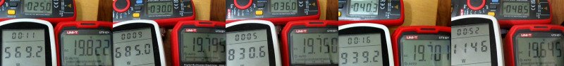 Сверху выходной ток, справа выходное напряжение, слева мощность от 220В: