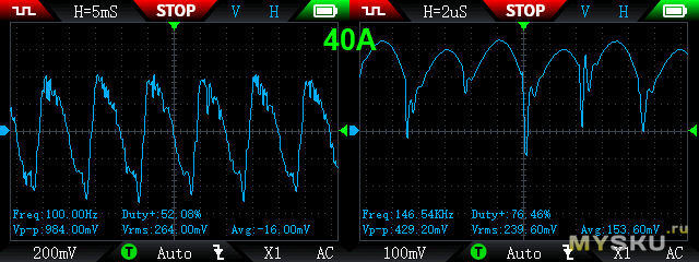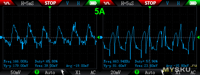 5А, ~200мВ на частоте сети и ~100мВ на частоте преобразования: