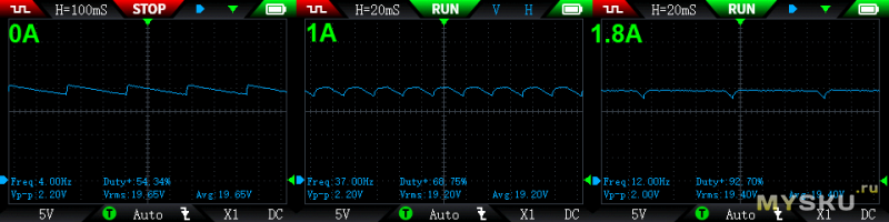 До 2А присутствуют низкочастотные пульсации амплитудой в пару вольт, выше они пропадают: