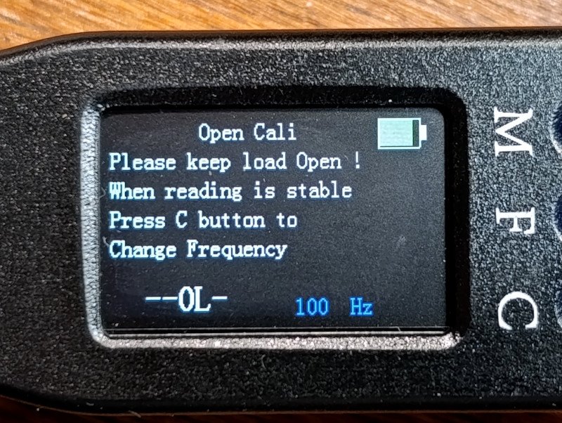 В прошивке есть возможность калибровки, она не документированна. Для этого надо коротко нажать С и потом его же зажать. Если калибровка с разомкнутыми контактами проходит на ура, то с закороченными это лоторея. Показания непрерывно меняются в очень широком диапазоне.Процесс этот не останавливается. По указанию на экране нужно нажать С для смены частоты когда показания «успокоятся». Нажимаешь когда нибудь, и что он там накалибровал непонятно.