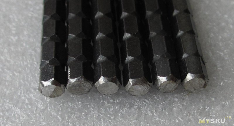 Распилить было решено по насечкам — и это оказалось ошибкой, при этом короткая часть все же оставлена на одно деление больше, что бы результат был чуть длиннее стандартных коротких бит. Насечки же оказались расположены от балды, на что я не обратил внимание, в итоге биты получились слегка разной длины. Не проблема, но неаккуратненько. Первый комплект: