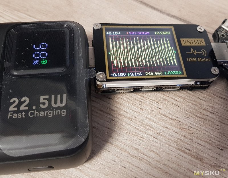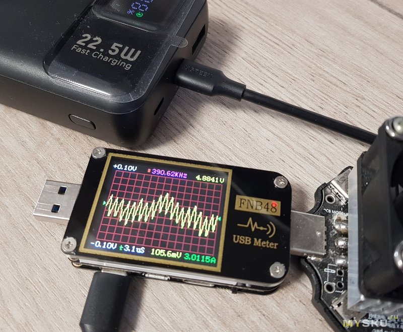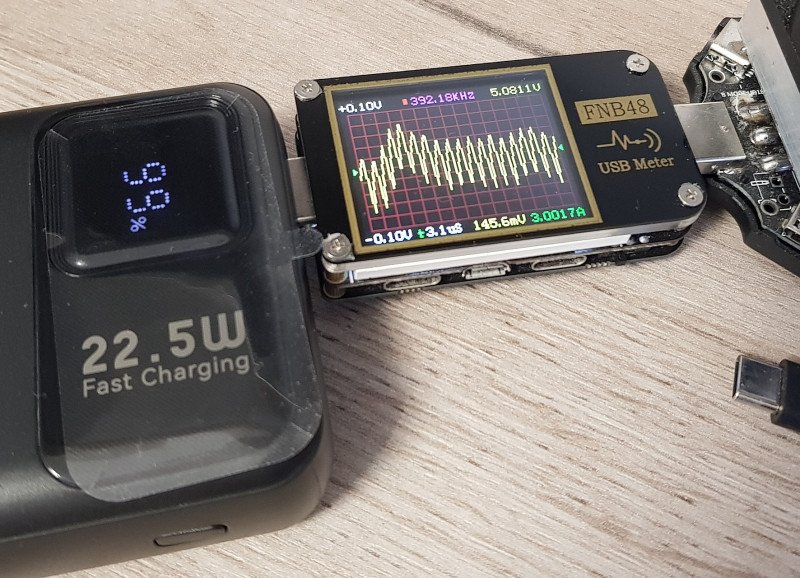 Пульсации. Тут самый критичный режим – 5-вольтовый. На порту USB-A с нагрузкой в 3 А пульсации доходили до 145 мВ (~3%). При 12 В и 1,8 А – до 246 мВ (~2%). Не фатально, хотя можно было бы и поменьше. При 5 В и 3 А на порту Type-C они составили уже 105 мВ (~2%).