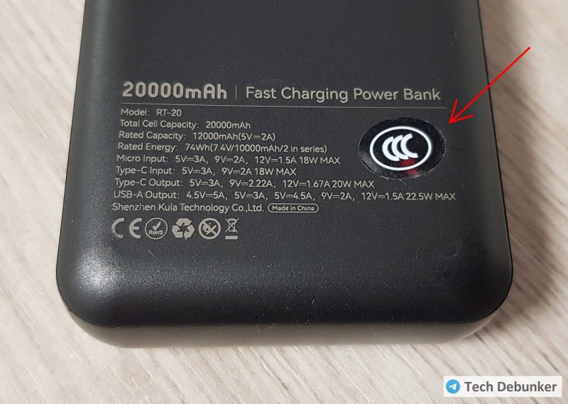 Многие спрашивают про маркировку ССС (обязательная сертификация в Китае), без которой пауэрбанки теперь отбирают в китайских аэропортах. Тут есть, но в виде кривой наклейки! Смяться или плакать – не знаю. Если такой номер прокатит на контроле, то можно самим накупить таких наклеек и обклеить все свои аккумуляторы.
