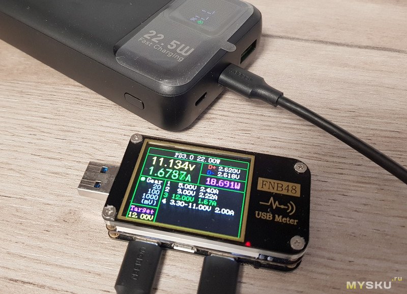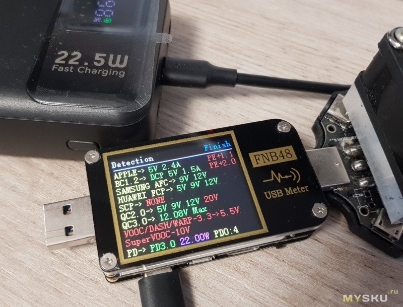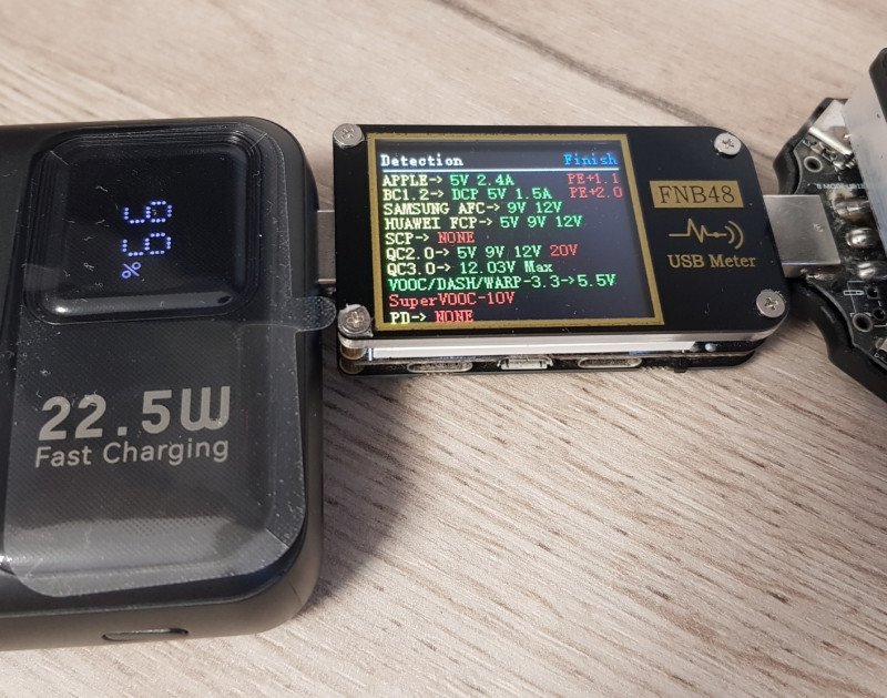 Поддержка протоколов. Старенький FNB48 показывает наличие поддержки QC 2.0, QC 3.0, Samsung AFC, Huawei FCP, SCP и VOOC. На порту Type-C – ожидаемая поддержка PD 3.0 до 22 Вт.
