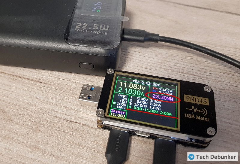 На порту Type-C с фиксированными профилями: 4,81 В и 3,8 А (18,3 Вт), 8,89 В и 2,41 А (21,5 Вт), 12,1 В и 1,83 А (22,2 Вт). А в режиме PPS – 11,08 В и 2,1 А (23,3 Вт).