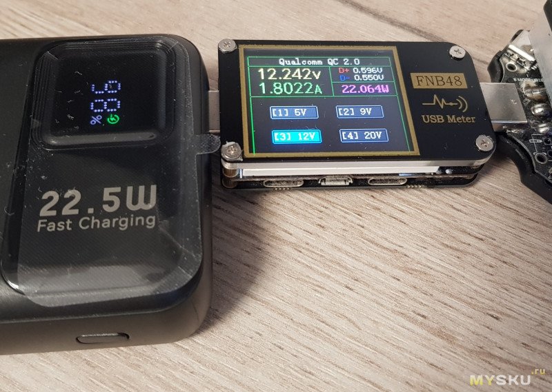 Мощность. Защита от перегрузки присутствует. При достижении критических значений пауэрбанк отключается. В итоге на порту USB-A удалось получить следующие предельные значения напряжения и токов: 5,06 В и 3,8 А (19,2 Вт), 9,04 В и 2,4 А (21,7 Вт), 12,24 В и 1,8 А (22 Вт).