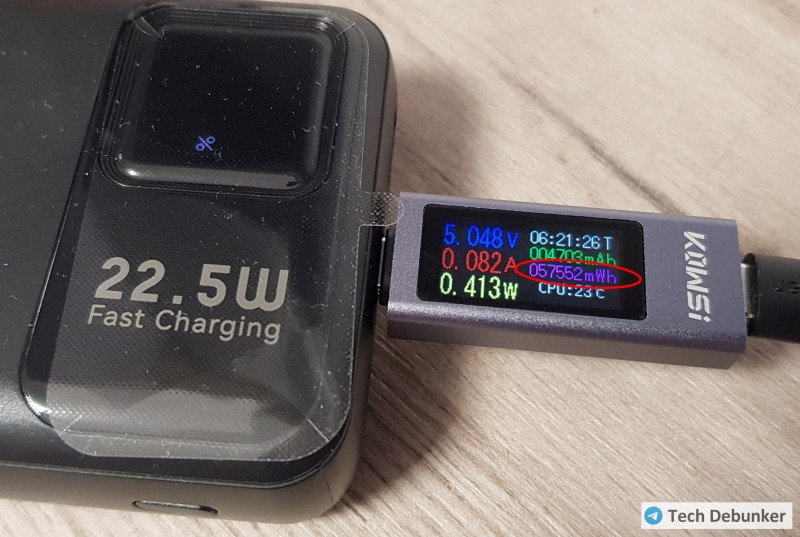 Перед нами дешевая рабочая лошадка. Обмана с емкостью нет – полученное значение 15600 мА*ч находится в типичных пределах для «двадцатитысячников». На практике эти пределы соответствуют диапазону от 15100 мА*ч до 18500 мА*ч, и в среднем – 16200 мА*ч. Цифры основаны на дюжине тестов «двадцаток», которые я собираю в отдельные таблицы и выкладываю в телеграм.