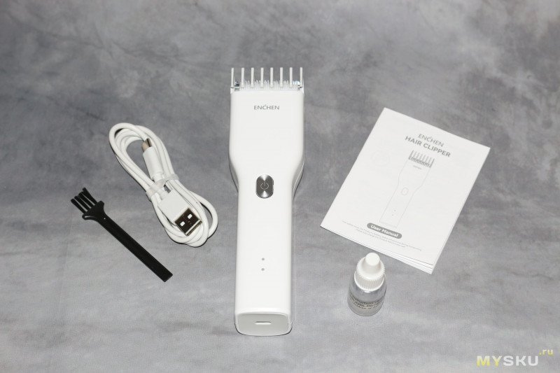 Комплект поставки: машинка, зарядный кабель, щеточка для очистки, пузырек со смазкой.
