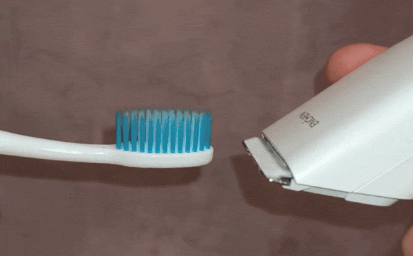 Не знал, как проверить режущие свойства, поэтому решил побрить зубную щетку с густой щетиной. Моя прошлая дешманская машинка этот тест проваливала, хотя по волосам работала вполне терпимо. ENCHEN Boost же уже на первой скорости стрижет щетину уверенно и довольно бодро.