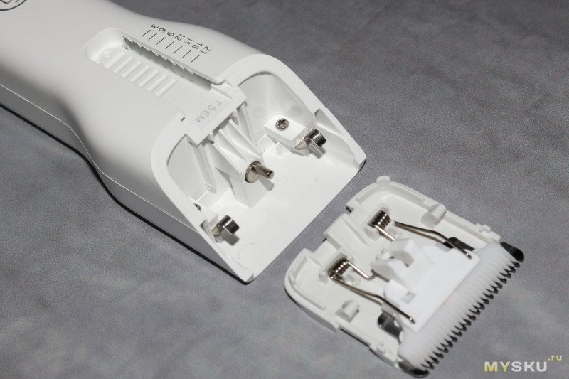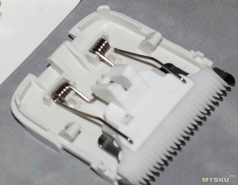 — конструкция. Сменные насадки имеют рёбра на всю высоту насадки, подвижная встроенная имеет тонкие «зубья» вместо них. По итогу реально работает только по прямым торчащим волосам, и то реальный рабочий диапазон длин — в районе сантиметра. Несмотря на то, что выдвигается она здесь на 21мм, такую длину даже прямых волос она сделать не сможет, если они не торчат строго вверх от кожи самостоятельно. Поднять их она не сможет, для этого в насадке должны быть «перепонки» между рёбрами. Если же вам надо стричь вьющиеся волосы (например, бороду) — такой машинкой вам не справиться с длиной больше нескольких миллиметров (т.е. на которой волосы ещё условно прямые-торчащие). Здесь нужна насадка со сплошными рёбрами и «перепонками» типа «ласточкин хвост» с выносом (Это когда зубья насадки выступают далеко вперёд за нож и направляют волосы на него. Эта встроенная насадка не способна направлять волосы на нож вообще, она лишь служит ограничителем высоты ножа над поверхностью.).