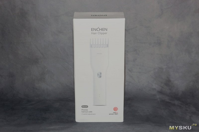 ENCHEN Boost поставляется в стильной белой коробке с качественной полиграфией. На лицевой панели есть отметка, что машинка в 2021 году выиграла престижную премию в области дизайна Red Dot.