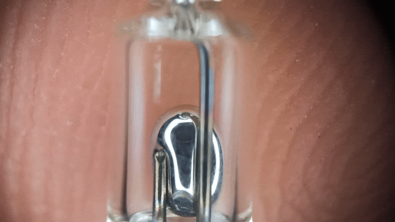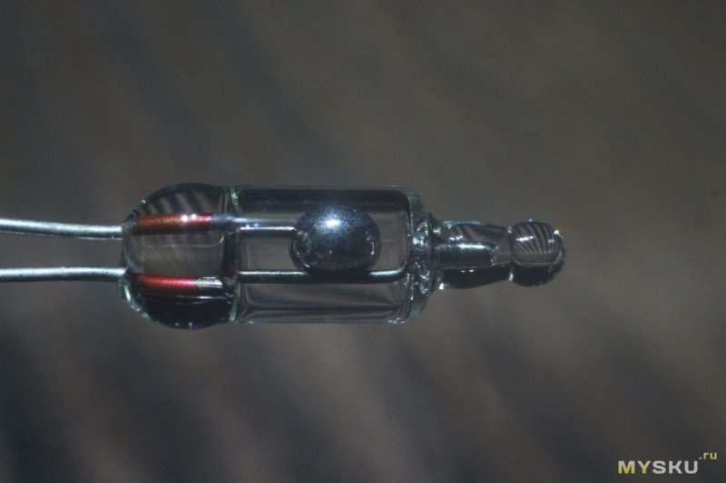 При ближайшем рассмотрении видно, что контакты внутри колбы разной длины. И шарик ртути замыкает их только будучи в положении ближе к нижнему краю датчика.