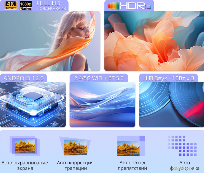 ● Smart Auto Correction – Auto focus, keystone, screen fit & obstacle avoidance (полная автофокусировка)