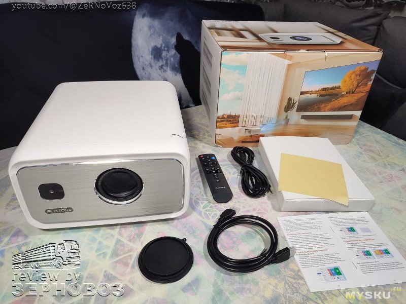 Комплект: проектор, пульт, кабель питания, HDMI — HDMI (визуально хорош), инструкция, тряпочка для линзы.