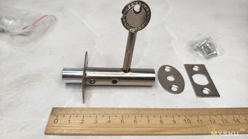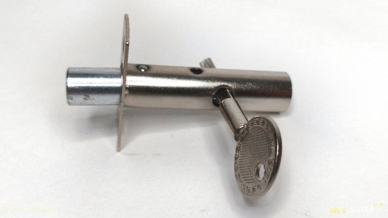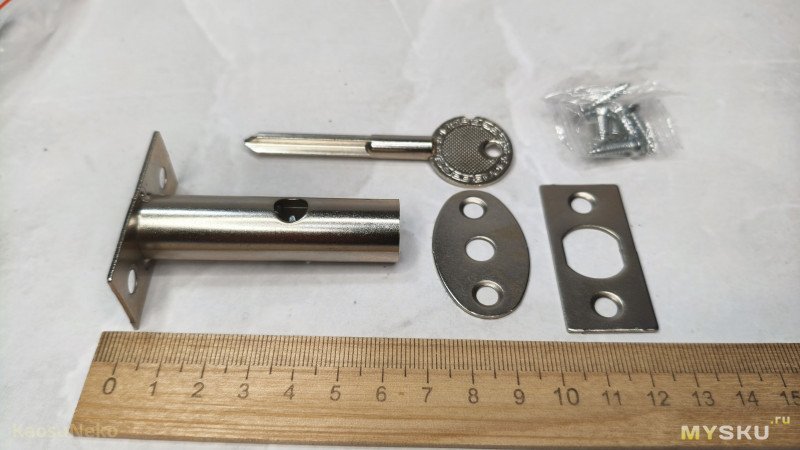 В комплекте — замок, ключ, декоративная накладка на замочную скважину, запорная (ответная) планка, саморезы. Ключ имеет X-образный профиль.