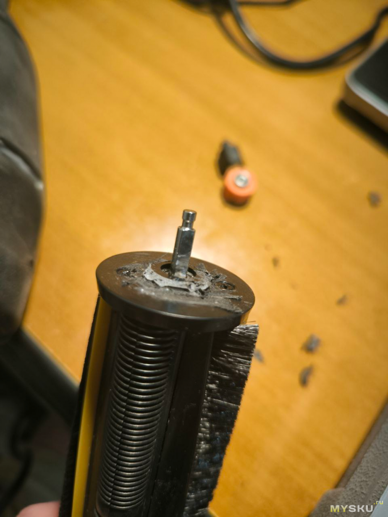 Про поспешные шаги-когда я обточил квадрат, в попытках уменьшить длину щётки и я немного отрезал от этого квадрата, а потом оказалось что длины не хватает для того чтобы воткнуться в привод пылесоса. Пришлось применить суперклей.