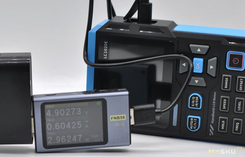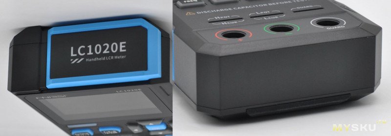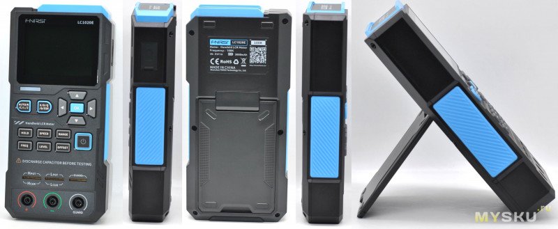 Внешний видПрибор LC1020E выполнен в форм-факторе мультиметра, для работы на столе есть подставка, сбоку резиновые накладки. Компоновка типовая — сверху экран, по центру сгруппированные кнопки (их хватает), снизу терминалы для щупов. Зарядный порт справа под защитной заглушкой. Индикатор заряда выведен на кнопку включения. Корпус крупноват, потому что унификация с другими измерителями (на разборке видно будет).