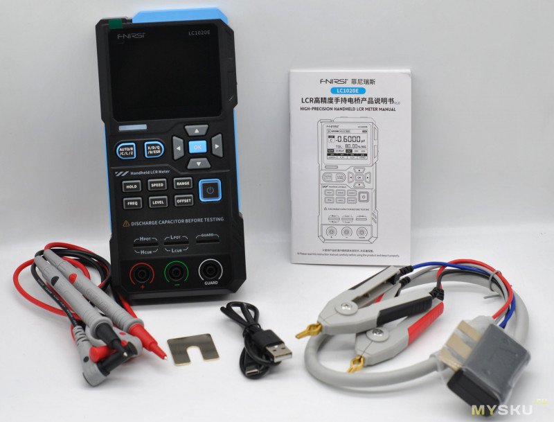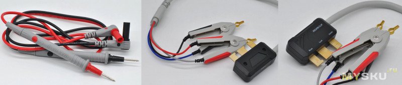 Обычные метровые щупы с иглами (как у мультиметра), шупы Кельвина с зажимами и с отдельным блоком для четырехпроводной схемы, кабель USB для зарядки и соединения с компьютером, пластина для калибровки, инструкция на китайском и английском языках.Оплетка обычных щупов могла бы быть более гибкой, щупы Кельвина длиной 50 см.