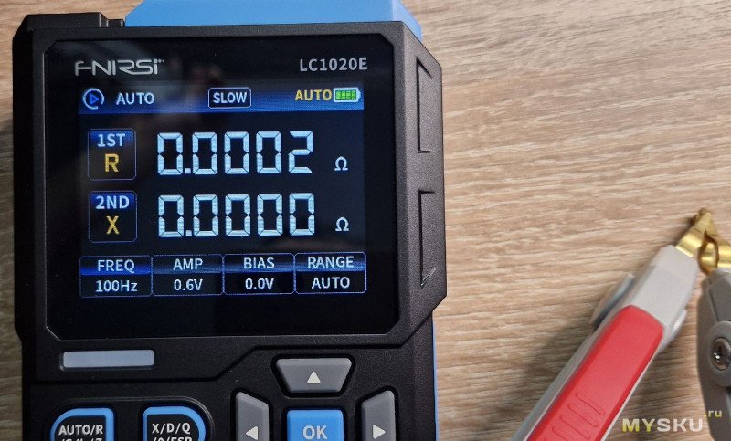 Экран LC1020E (60х44 мм) отображает измеренные параметры в две строки (1-я L, C, R, Z и 2-я X, D, Q, θ, ESR), сверху и снизу служебная информация. Разрешение дисплея: 4,5 разряда. Есть память измерений, но на ПК сбросить в виде таблицы нельзя.
