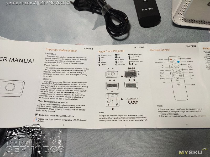 Комплект: проектор, пульт, кабель питания, HDMI — HDMI (визуально хорош), инструкция, тряпочка для линзы.