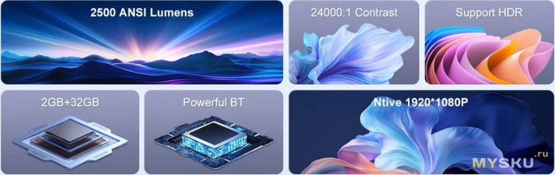 Контраст заявлен на уровне 24000:1. Различные современные плюшки типа автофокуса и настроек трапеции. Память 2/32Гб. Современный Android 12, HDR10+, декодирование 4K и нативное разрешение 1080P (FullHD).