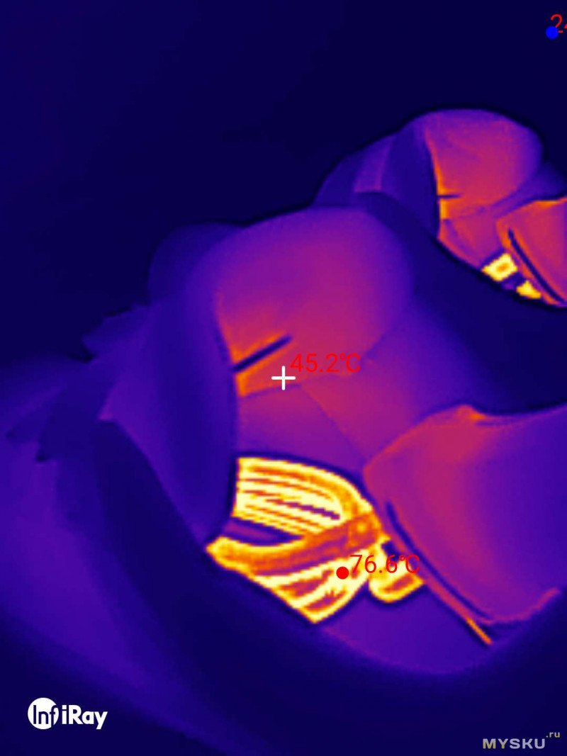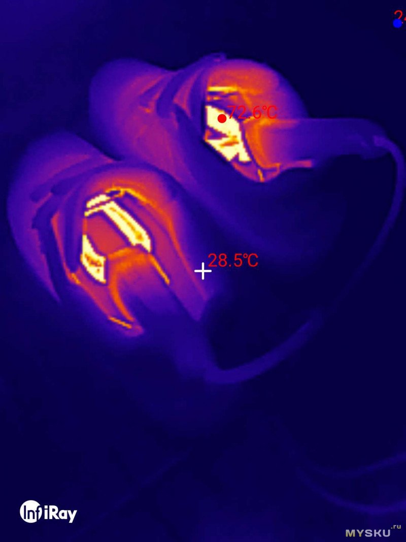 Опять же, не уверен, что пирометр претендует на 100% точность, но другого нет. Он в пике показал 72°C. Тактильно — нагрев равномерный по всему корпусу, но 72°C мой пирометр, скорее всего, принял с самой пластины. Корпус же достаточно тёплый, но при этом его возможно держать в руках. По ощущениям под 55-60 градусов, чего в принципе хватает для хорошей просушки, но в то же время нет губительного эффекта для самой обуви.