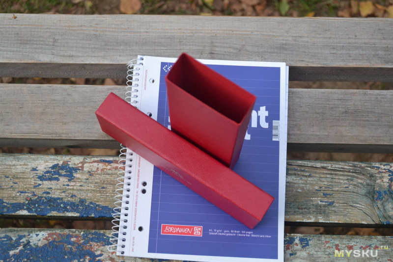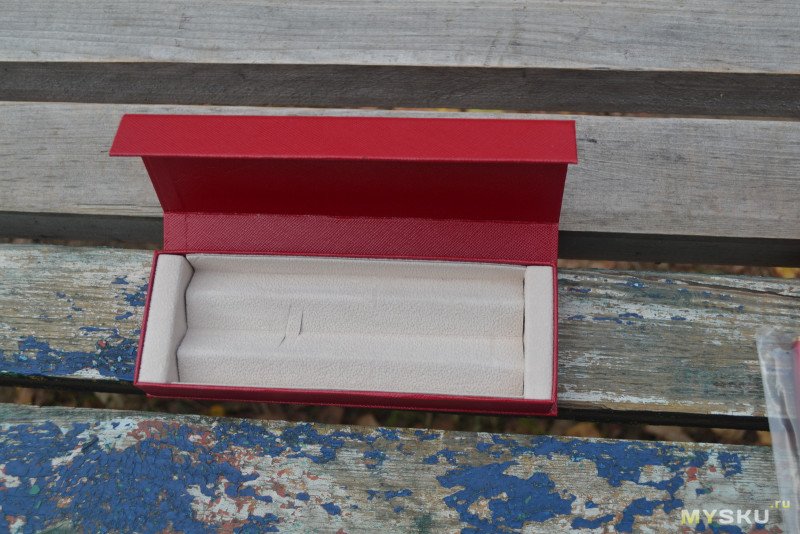 Внутри ларца ложе из картона и имитации замши с прорезью для удержания ручки. Ручка с завода приходит в плотном полиэтиленовом пакете с тугим замком.