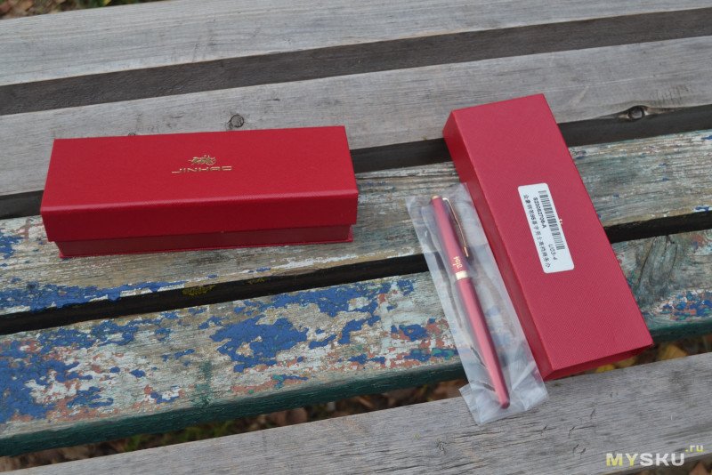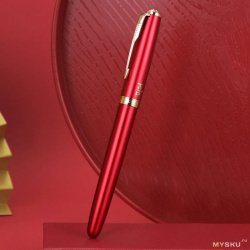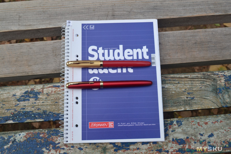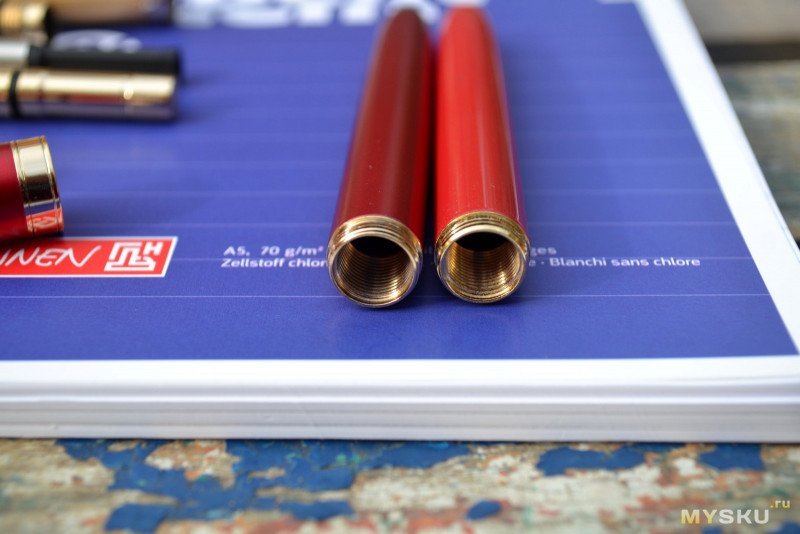 Вот, сравните. Полностью красная ручка смотрится более гладкой, серьезной и не так блестит обилием фальшивого золота из нитрида титана. Всего-то опять стрелка, клип в стиле «Паркер» и золотое кольцо.
