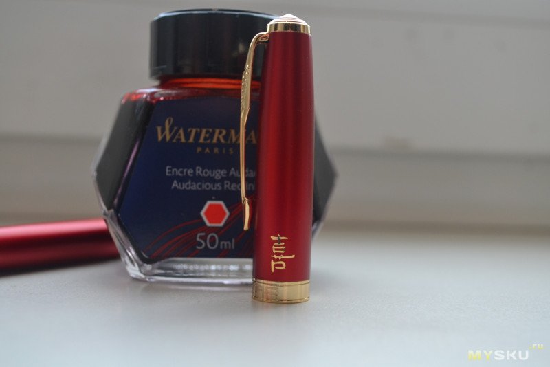 На колпачке ручки, кроме клипа в паркеровском стиле, выдавленного фирменного названия, есть одинокий золотой рукописный иероглиф.
