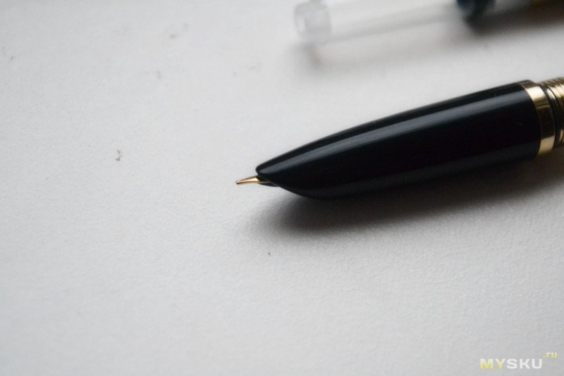 Что перо. Острая иголка трубчатого пера с имитацией золотого покрытия. За 5$ золотое перо ставили лет так 60 назад. Как пишет? Да как гвоздь. Какая, к черту, вариативность и обратная связь. Линия постоянная по ширине, но можно надавить посильнее. Перо выдержит. Оно сделано из прочной кислотоустойчивой стали. Ручка переживет чернила водянистые, черные с печной сажей или железо-галловые без потери работоспособности. Перо скорее F. Если легкая рука, то и EF может почти получиться.