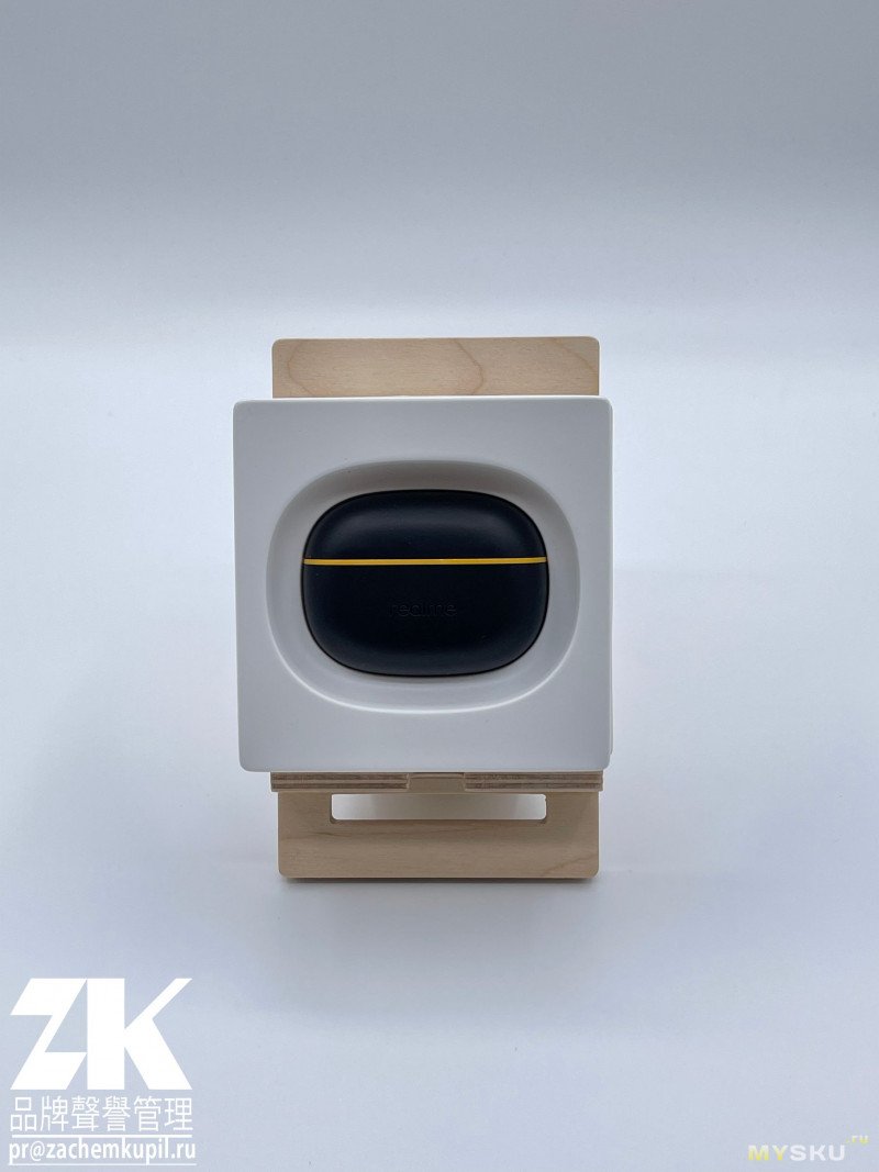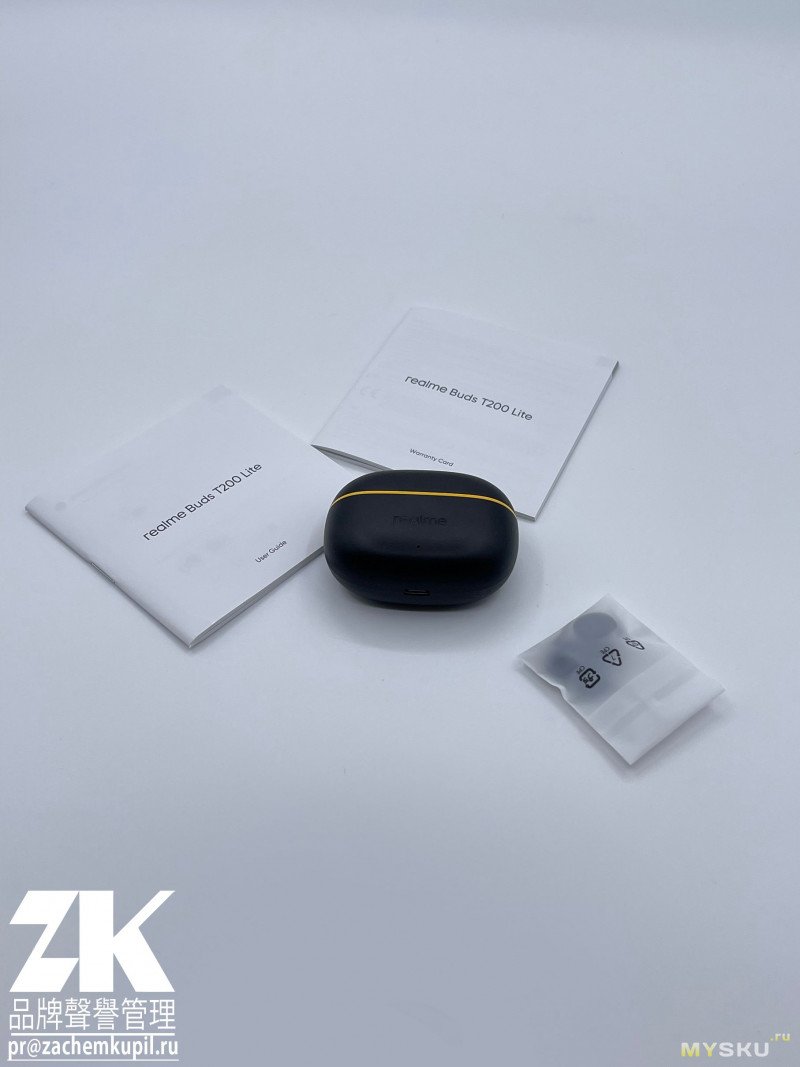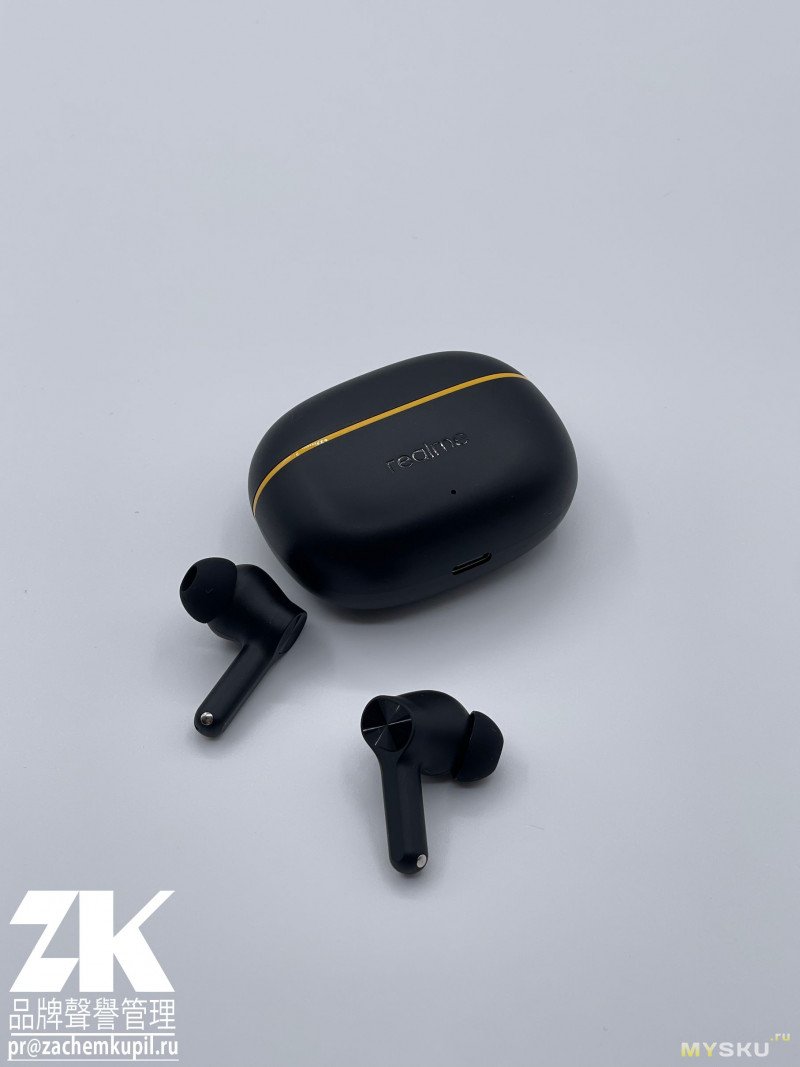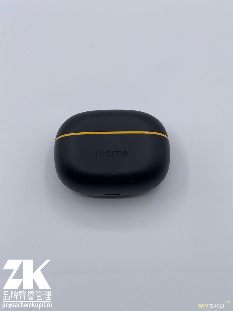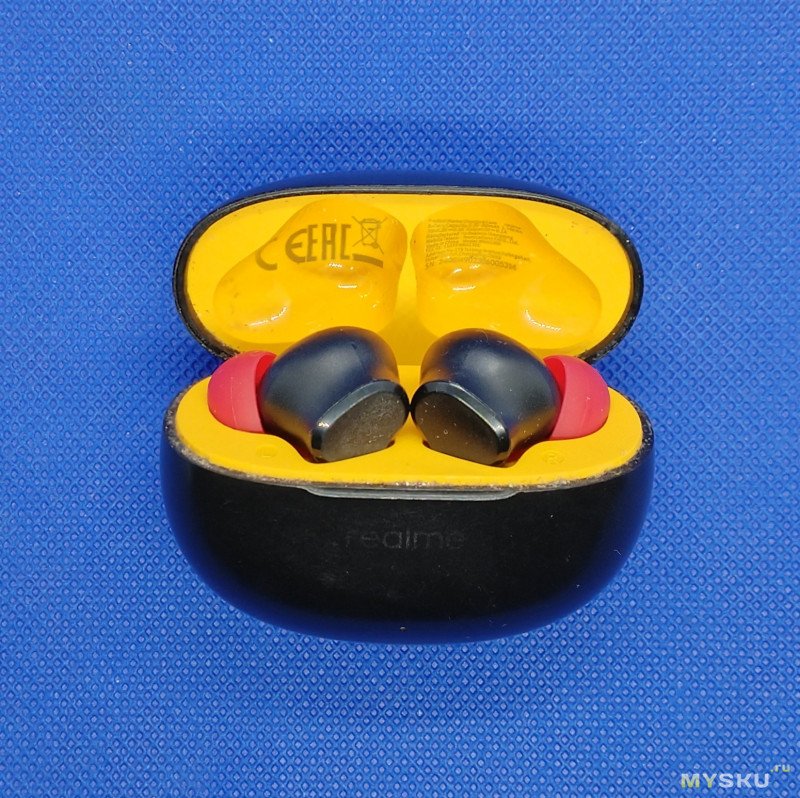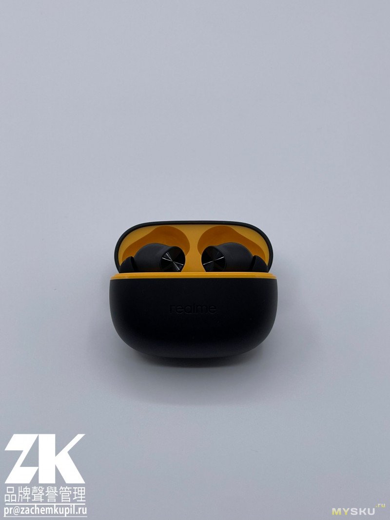 После вскрытия коробки сразу бросается в глаза черный кейс с контрастной желтой вставкой в ложементе — минимальный, но эффектный акцент, который подчеркивает фирменную стилистику Realme. Комплектация, несмотря на яркое оформление, остается сдержанной: без лишних аксессуаров, но все необходимое (наушники, кейс, амбушюры) присутствует. Классически не положили кабель для зарядки. Тенденция удручающая.
