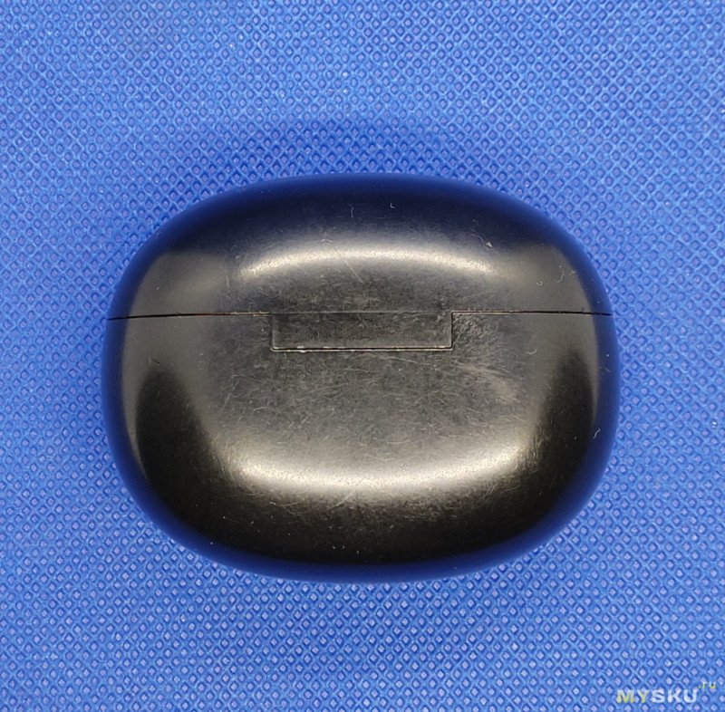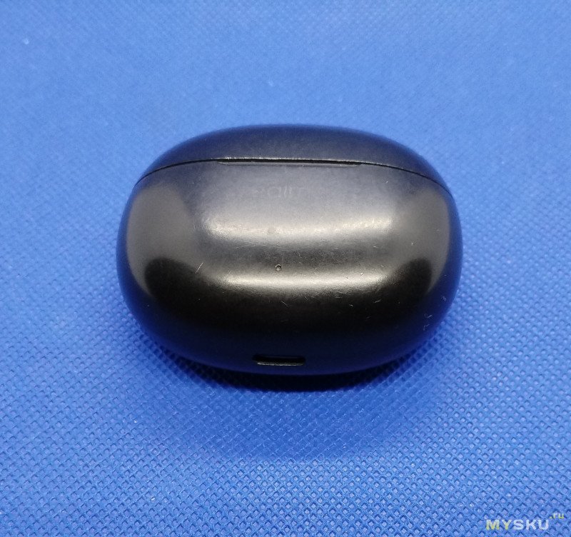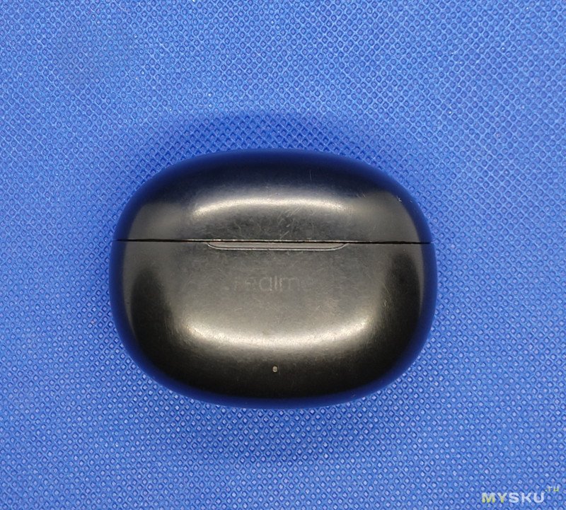 Кейс выполнен из матового пластика и имеет овальную форму, напоминающую гладкий речной камень. Такой форм-фактор хорошо лежит в руке и не скользит. Материал устойчив к отпечаткам и приятен коже, но нельзя сказать, что это полноценный софт-тач. На фронтальной стороне расположена небольшая надпись Realme и светодиодный индикатор, отображающий состояние подключения или уровень заряда. На задней стороне только порт USB Type-C. Физические кнопки на корпусе отсутствуют, сброс и переподключение выполняются автоматически.