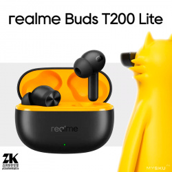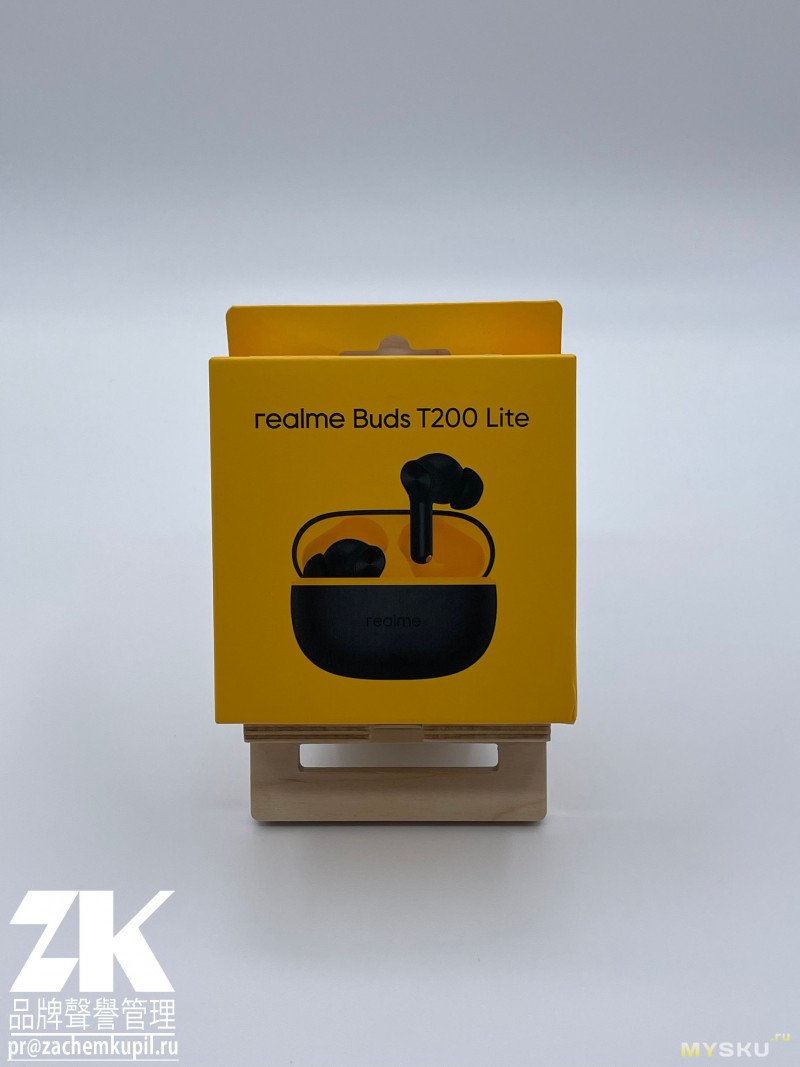 Упаковка Realme Buds T200 Lite выполнена в традиционном фирменном стиле бренда: яркая желтая коробка с изображением наушников и названием модели спереди, а на оборотной стороне — ключевые характеристики и краткое описание возможностей устройства.