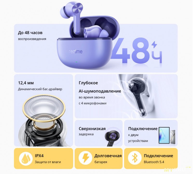 Из ключевых характеристик можно воспроизведение до 48 часов (фактически — 6 без подзарядки их кейса), 12.4 мм драйверы (а не 9.2 мм, как в большинстве затычек), низкую задержку звука, священный мультипоинт, Bluetooth 5.4 и вездесущий ENC с модным словом AI.