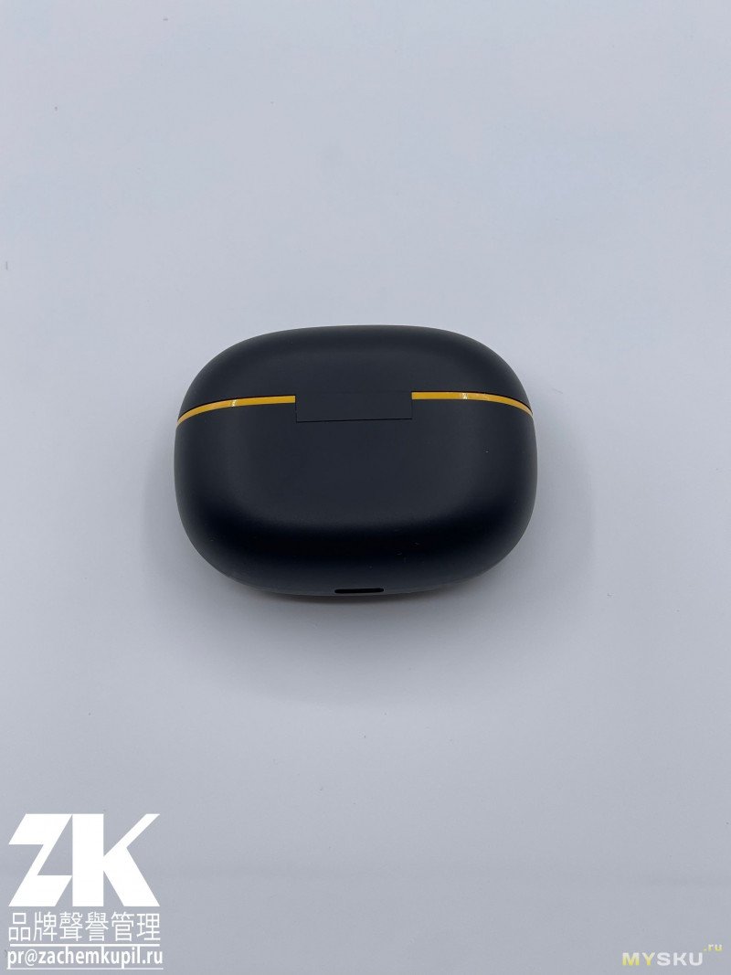 Открыв крышку, можно увидеть жeлтый ложемент с чeткой ориентацией ячеек для каждого наушника. Благодаря разно-полюсным магнитам перепутать левый и правый просто невозможно. Наушники фиксируются надeжно и не вываливаются, даже если резко потрясти кейс. Сами наушники имеют классическую форму с короткой, слегка изогнутой ножкой, где расположены микрофоны. Сенсорные панели получили гравированную текстуру, что облегчает управление — по ним легко попасть пальцем, даже в перчатках. Форма корпуса рассчитана на универсальную посадку, и благодаря правильно подобранным амбушюрам наушники удобно сидят в ушах и подходят для длительного ношения.