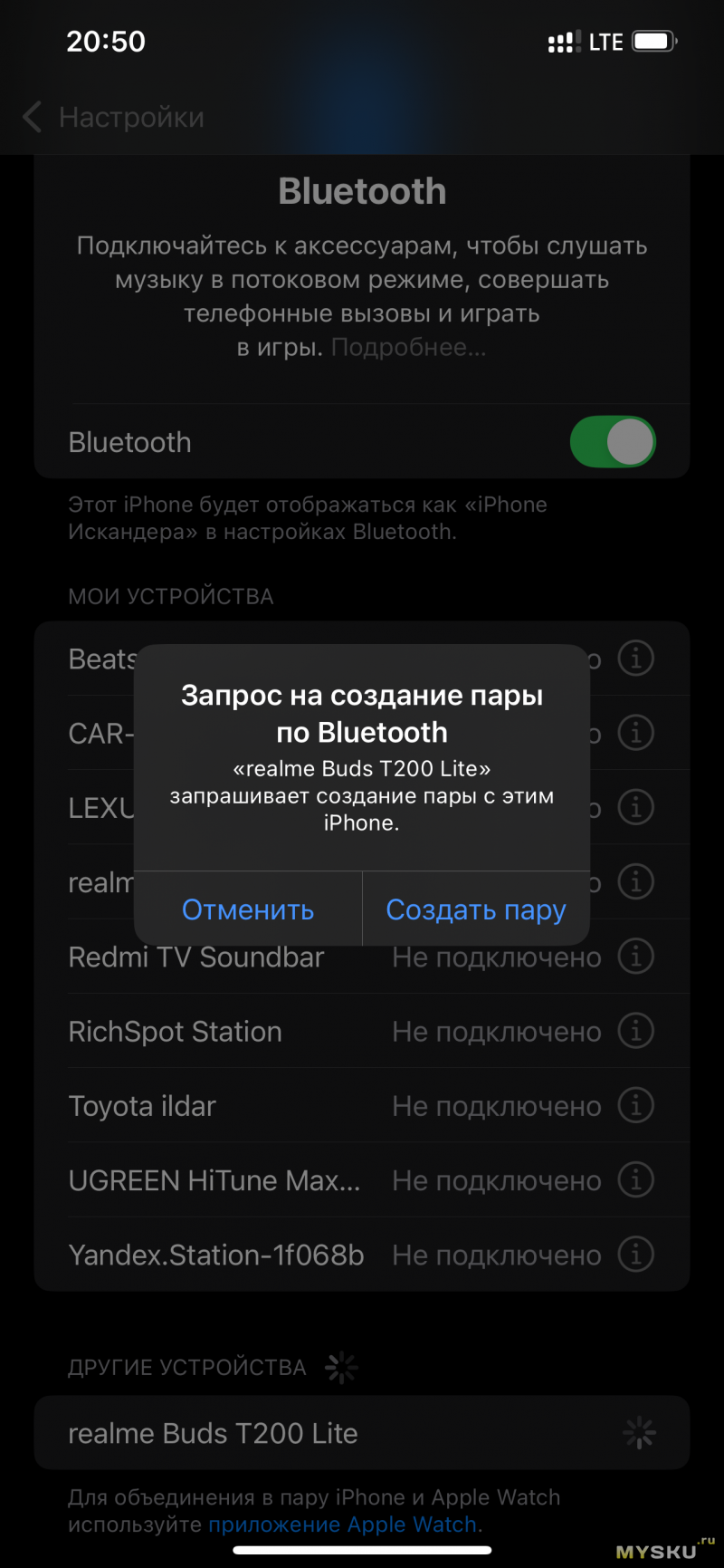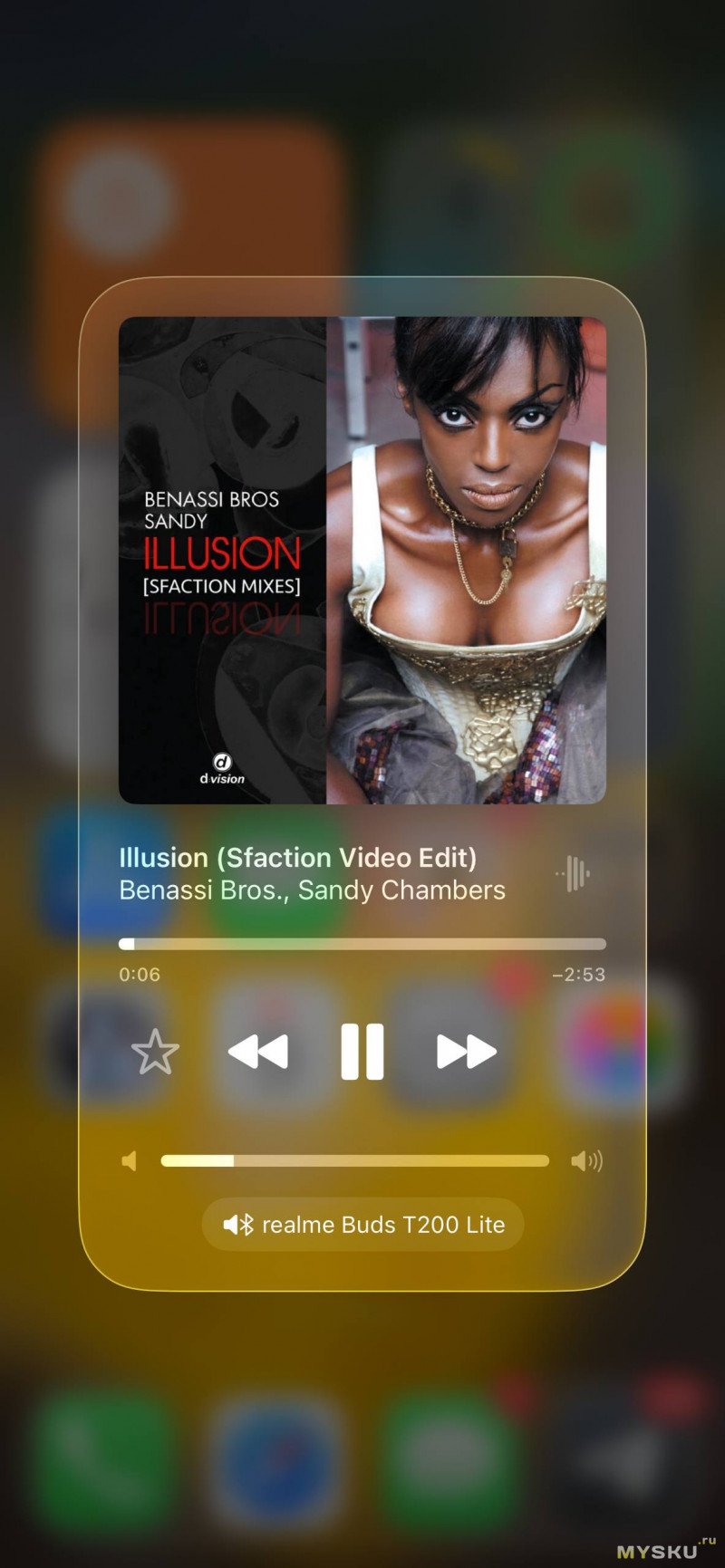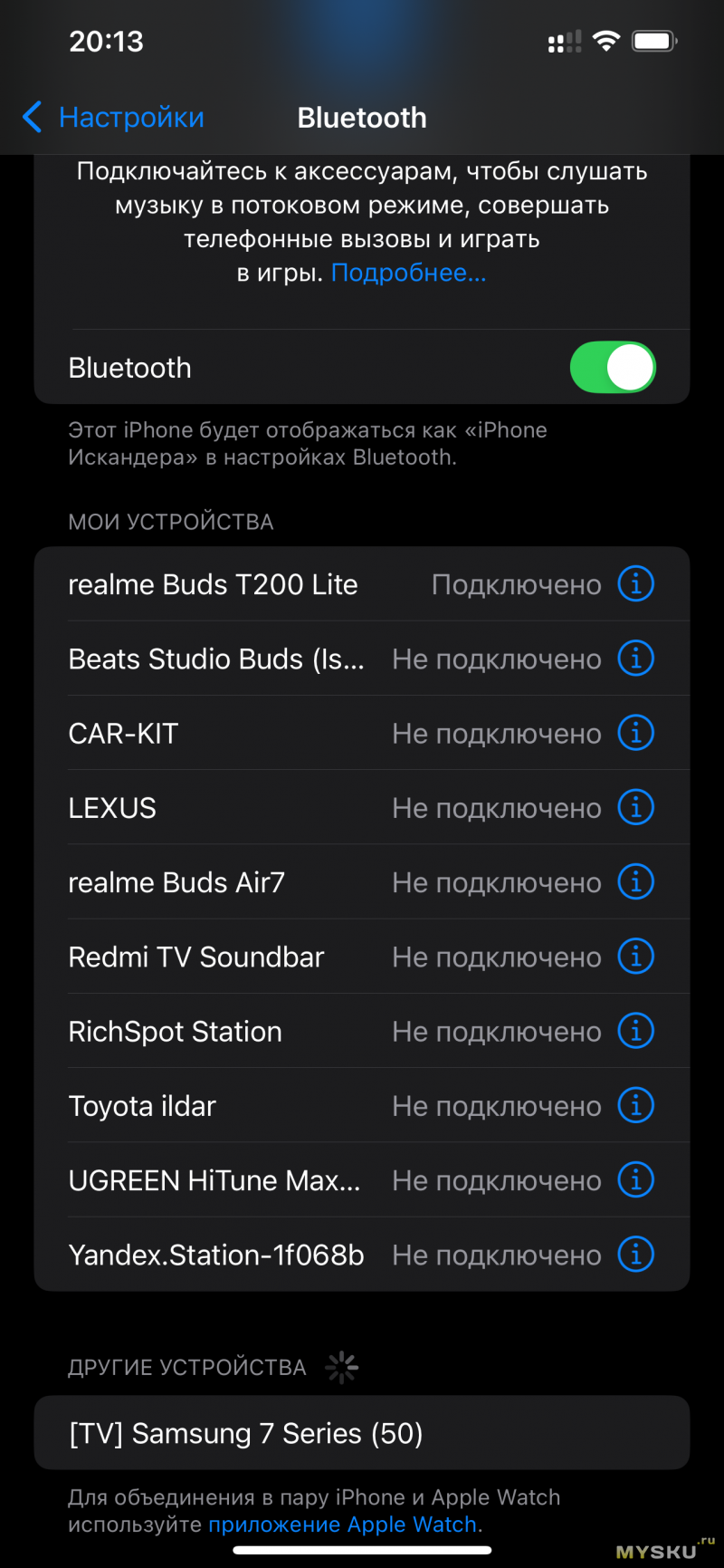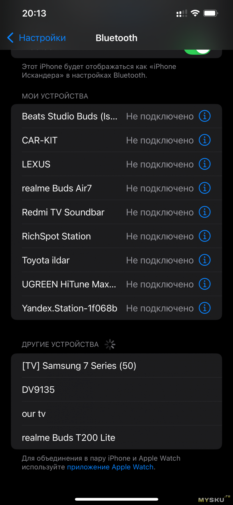 Мультипоинт. Он тут есть, но не бесшовный, как в техникe Apple и вся настройка происходит только через Realme Link. Устройств для одновременного подключения только два и желательно, чтобы это не было два телефона, ввиду исключения конфликтов и согласований в процессе переключения. Нормальной работы между двумя телефонами у меня так и не получилось добиться, но в режиме сопряжения телефон+планшет (Android+Ipad), телефон+телевизор (Android+Android TV) или телефон+ноутбук (Android+Macbook) наушники показали себя прекрасно!А что со звуком? Звучание можно охарактеризовать как теплое и насыщенное. Бас выраженный, плотный, но при этом не «глухой». Средние частоты отыгрываются чисто: вокальные партии звучат естественно и не теряются за инструментами. Высокие частоты не режут слух и не создают неприятной металлической окраски, что характерно для многих бюджетных моделей. Благодаря крупным драйверам звук получается более объемным, чего не ожидаешь от модели этого диапазона. Конечно, это не уровень премиальных наушников, но для повседневного использования качество очень достойное. Шумоподавления как такового тут нет и присутствует только ENC для разговоров, и его качество стандартное: шумы убирает, но голос получается слегка приглушенным. Вообще, я бы предпочел, чтобы ENC можно было отключать: стандартные функции iPhone, такие, как «Изоляция голоса», «Широкий спектр» и «Стандартный» голос из коробки умеют неплохо фильтровать шумы и задвоение функций приводит к классическому голосу из бочки. Но что есть, то есть и с этим ничего сделать нельзя. Отдельно огорчило время работы наушников без подзарядки — едва вытянув 6 часов, наушники несколько раз предупреждают о готовящейся кончине батареи. Глупо, конечно, требовать от наушников за 1000 с лишним рублей более длительного времени работы, но тем не менее.