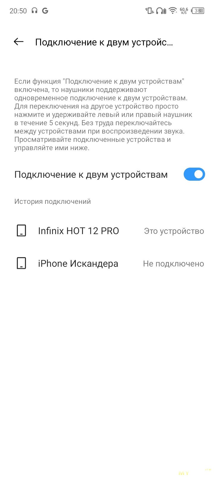 Мультипоинт. Он тут есть, но не бесшовный, как в техникe Apple и вся настройка происходит только через Realme Link. Устройств для одновременного подключения только два и желательно, чтобы это не было два телефона, ввиду исключения конфликтов и согласований в процессе переключения. Нормальной работы между двумя телефонами у меня так и не получилось добиться, но в режиме сопряжения телефон+планшет (Android+Ipad), телефон+телевизор (Android+Android TV) или телефон+ноутбук (Android+Macbook) наушники показали себя прекрасно!