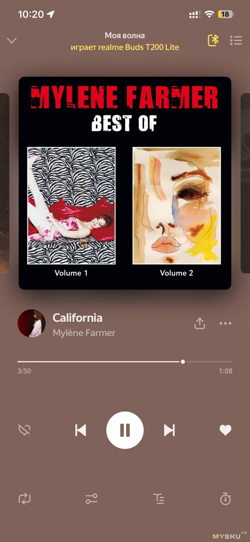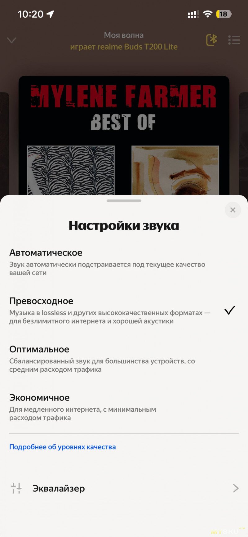 А что со звуком? Звучание можно охарактеризовать как теплое и насыщенное. Бас выраженный, плотный, но при этом не «глухой». Средние частоты отыгрываются чисто: вокальные партии звучат естественно и не теряются за инструментами. Высокие частоты не режут слух и не создают неприятной металлической окраски, что характерно для многих бюджетных моделей. Благодаря крупным драйверам звук получается более объемным, чего не ожидаешь от модели этого диапазона. Конечно, это не уровень премиальных наушников, но для повседневного использования качество очень достойное. Шумоподавления как такового тут нет и присутствует только ENC для разговоров, и его качество стандартное: шумы убирает, но голос получается слегка приглушенным. Вообще, я бы предпочел, чтобы ENC можно было отключать: стандартные функции iPhone, такие, как «Изоляция голоса», «Широкий спектр» и «Стандартный» голос из коробки умеют неплохо фильтровать шумы и задвоение функций приводит к классическому голосу из бочки. Но что есть, то есть и с этим ничего сделать нельзя. Отдельно огорчило время работы наушников без подзарядки — едва вытянув 6 часов, наушники несколько раз предупреждают о готовящейся кончине батареи. Глупо, конечно, требовать от наушников за 1000 с лишним рублей более длительного времени работы, но тем не менее.