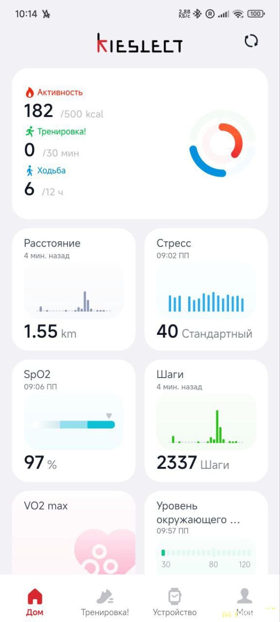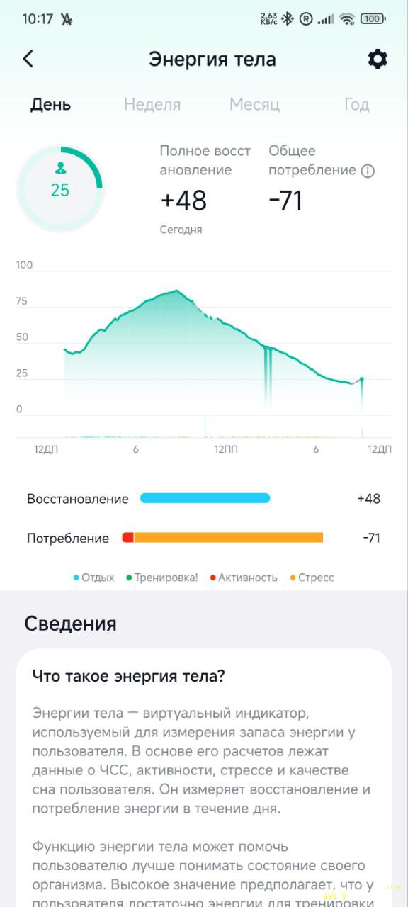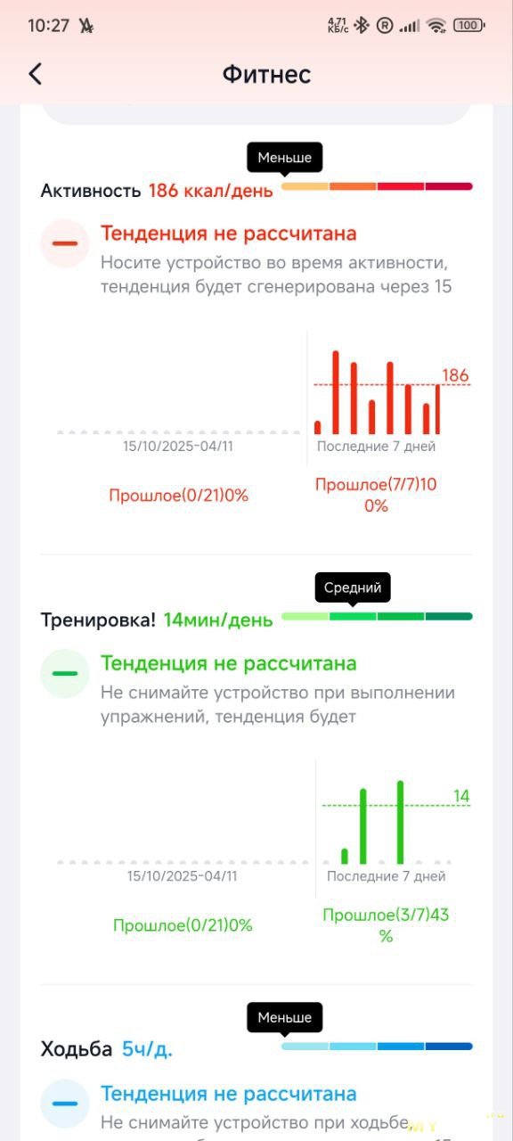 Мониторинг здоровья: работает круглосуточно. Оптические датчики фиксируют пульс, уровень кислорода в крови (SpO₂), уровень стресса и «энергию тела». Эти показатели помогают отслеживать состояние организма в течение дня. Датчики реагируют быстро и дают нормальные результаты.