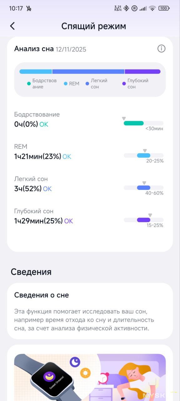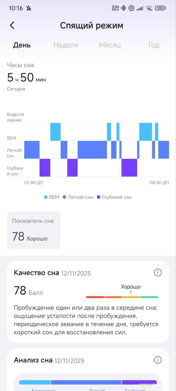 Сон: часы фиксируют продолжительность сна, определяют фазы — лёгкую, глубокую и быструю. В приложении отображается качество сна, рекомендации по восстановлению и статистика за неделю. Данные совпадают с самочувствием на утро.