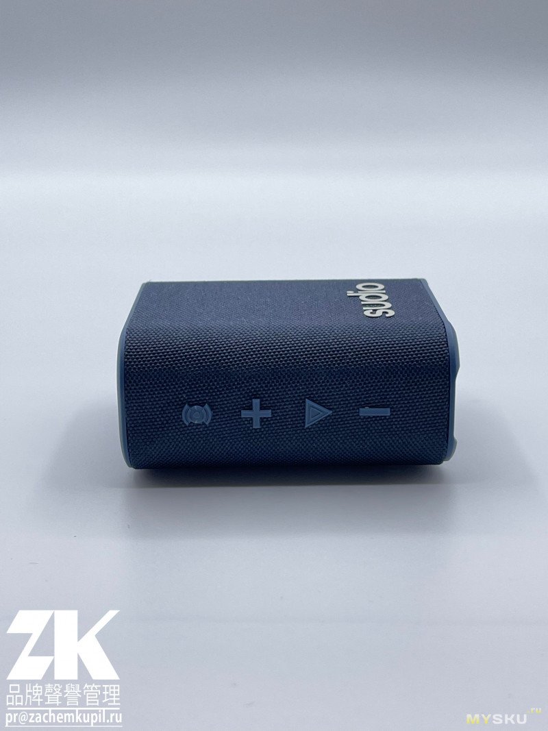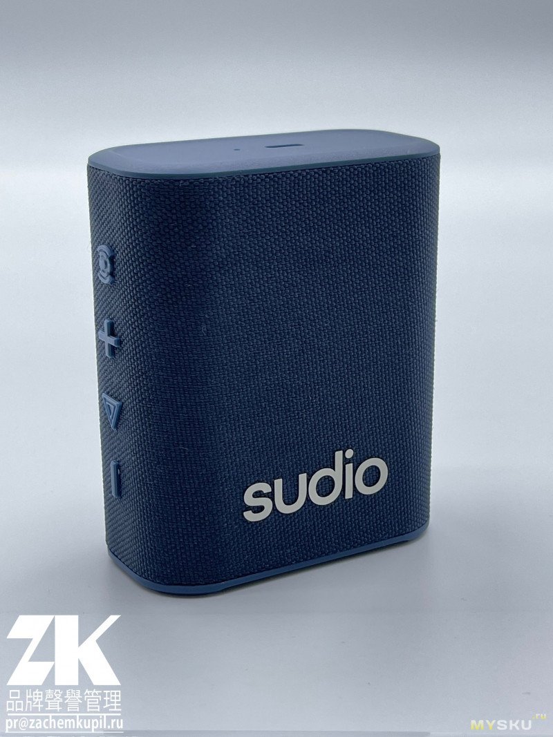 Корпус Sudio S2 сочетает пластик с приятной тканевой отделкой, создавая ощущение скандинавской минималистичности с явной отсылкой к продукции JBL. Активный динамик защищён прорезиненным козырьком, что значительно снижает риск повреждений. Логотип Sudio на передней панели выполнен аккуратно методом термо-переноса. С торца располагаются кнопки управления громкостью, переключением треков, а также кнопка воспроизведения и паузы. Выпуклая форма кнопок позволяет управлять колонкой вслепую, не вынимая ее из кармана или сумки.