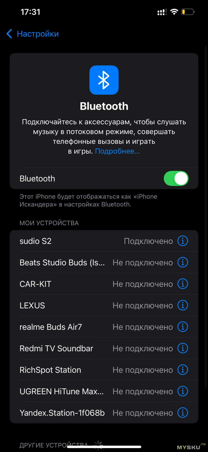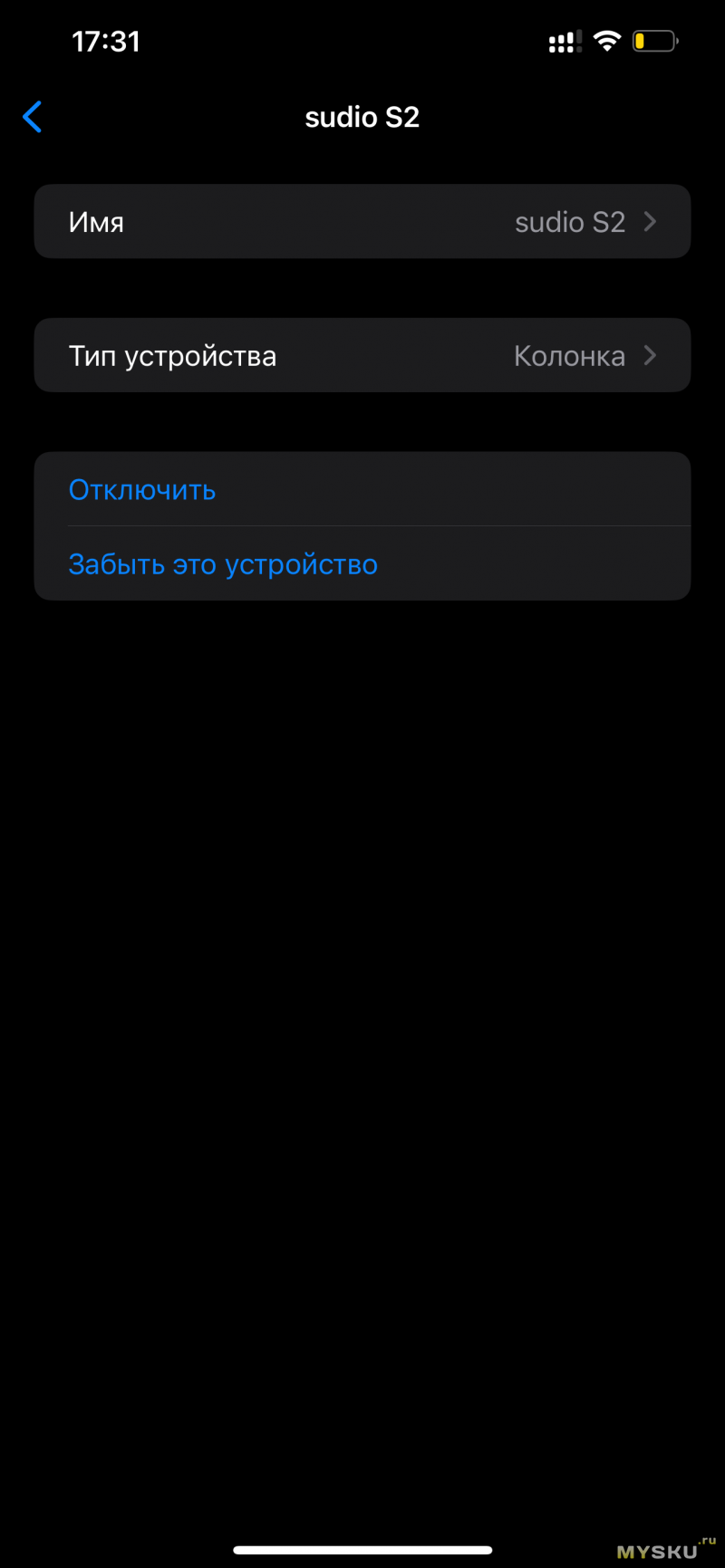 Задняя часть колонки покрыта прорезиненным материалом и оснащена крупным пассивным излучателем. На тыльной стороне находится порт USB‑C для зарядки и светодиодный индикатор состояния подключения. Плоские края корпуса делают колонку устойчивой на любой поверхности. Колонка достаточно компактная и удобно помещается в руке. Но меньше слов, больше про звук и подключения, ведь это обзор колонки. Несмотря на наличие фирменного приложения Sudio, колонка не поддерживает в нем подключения и все действия приходится повторять по старинке — через настройки, что на IOS, что на Android. Рассмотрим, как происходит подключение к iPhone и какие функции доступны.