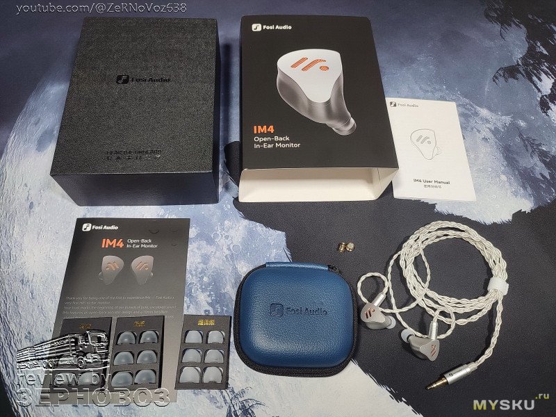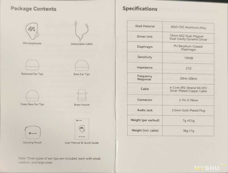 Комплект: кейс (жёсткий, с текстурой под кожу), наушники, съёмный кабель, 9 пар амбушюр, 2 пары звуко/волноводов (nozzle), памятка и инструкция.