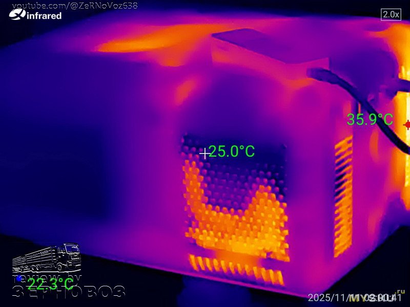 Корпус большой. Радиатор большой. Нагрев маленький. Потребление почти 200Вт. Вентилятор в тихом режиме можно бы и потише, но ладно, охлаждать то надо.