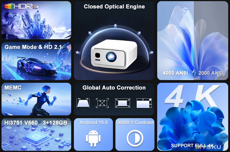 Ультимативно и всерьёз. Просто включаем и смотрим. Плавно летает, ярко светит, громко играет. Если чуть подробнее: заявлено 4000 ANSI lumens, FullHD с декодированием 4К на лету, заявленный контраст 36 000:1, аудиосистема 3х12 Вт и режим беспроводной колонки. Android 15 с поддержкой HDR10+ и высокая чёткость картинки.