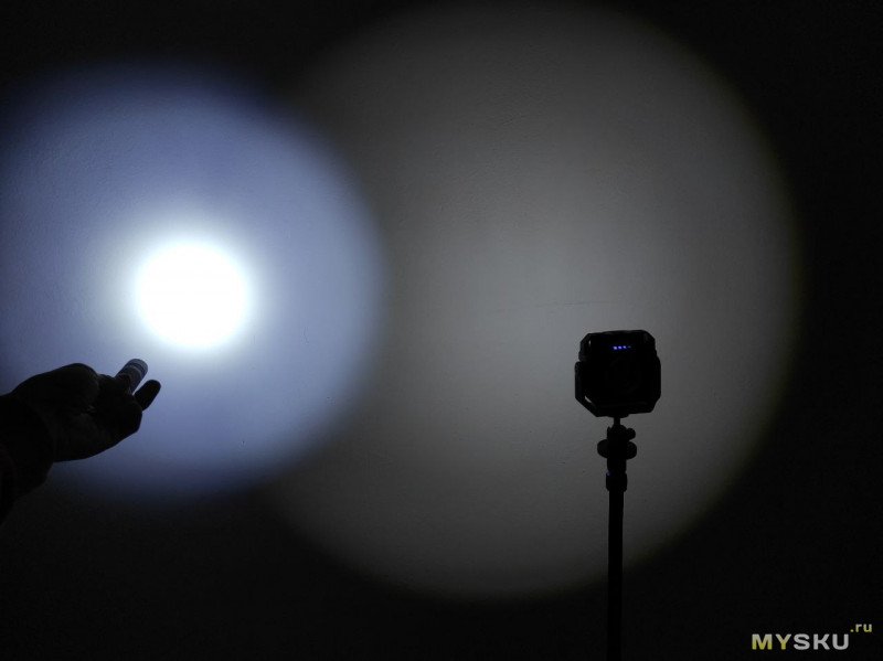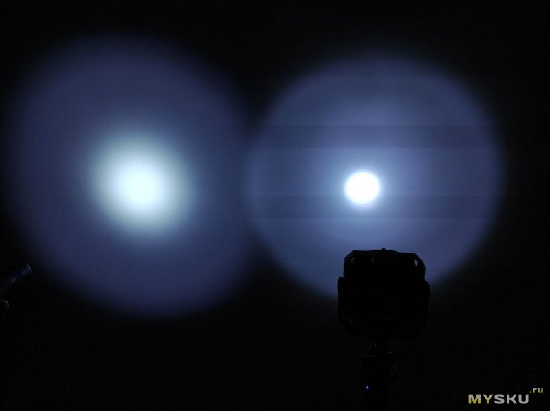 Сравнил свет фонаря на максимальном режиме с конвоем S2 с током 3А. То есть конвой слева выдает около 1000 люмен. Хотя он старый, XML подсел, я думаю около 800 люмен.