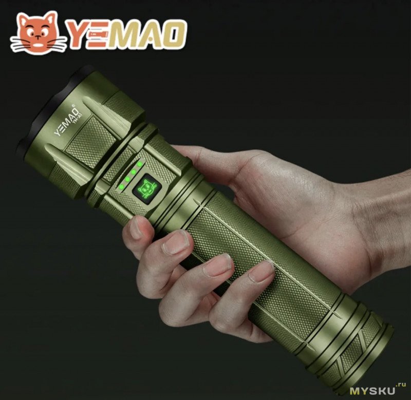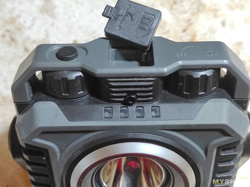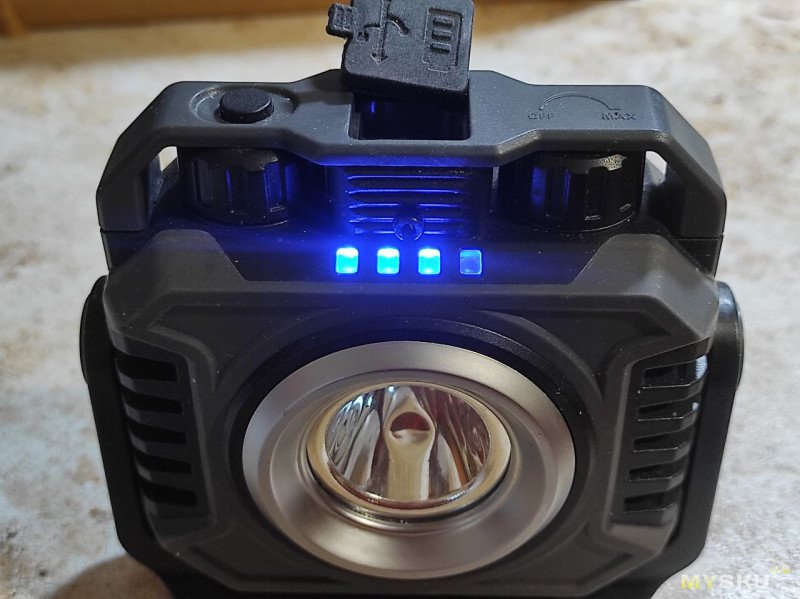 На верхней части фонаря есть 4 светодиода, которые показывают уровень заряда.